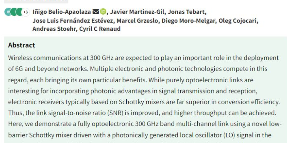 Our PhD student Javier Martinez Gil has contributed on the development of low-barrier mixers at 0.3 THz, which require 10 times less LO power compared to traditional GaAs state-of-the-art mixers, paving the way for more effective applications in high-frequency domains. For those interested in a deeper dive into the technical details, check out the full explanation in our paper: “Efficiency Assessment of Traditional GaAs and Low-Power InGaAs Schottky Diodes in Full-Band Mixers at 0.3 THz”.