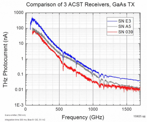 summarises comparative measurements of three …A1 Detectors in a Photoconductive setup at Toptica Photonics AG (Germany). These three detectors are selected with maximum difference from each other. That means, the performance of detectors delivered to the customer may vary within these frames. Since measurements have been done in laboratory environment, water lines are clearly seen on the spectrum at several point frequencies starting with about 550 GHz and up to about 1400 GHz. This indicates that the measurements are performed correct and the detector signal indeed corresponds to the indicated frequency and are not just an artefact due to misinterpretation of the measurement results. After about 1.5 THz the signal is probably lost because at higher frequencies the THz signal from the used photoconductive setup becomes very small and below the noise floor of the detector. In fact, the noise floor of this detector is about 10 – 15 dB below 0.01 nA, and water lines should be seen up to about 2 THz. However, quasioptical measurements at such high frequencies are very tricky. Therefore, a good measurement setup and skilled operators are required to accurately perform such measurements. Measurement in another setup has demonstrated responsivity up to 1.7 THz and that was limited by available THz power at higher frequencies.