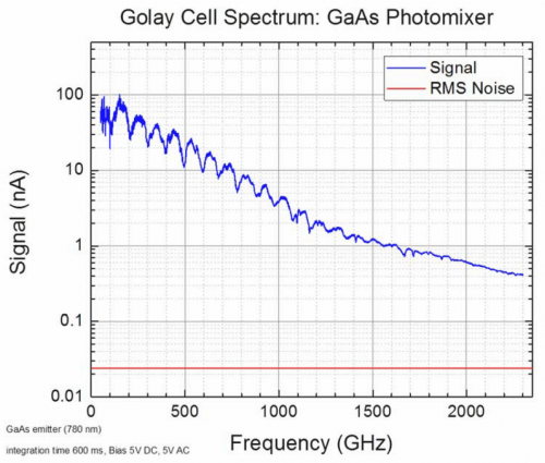 shows measurement results of the GaAs photoconductive setup used in Figure 1, but using a Golay Cell detector. The Golay Cell detector is assumed to have a frequency-independent response up to several THz but is very slow and not suitable for many applications. In fact, the ACST QOD were developed to replace the Golay Cell for applications, where fast response is required. Nevertheless, the results from Figure 2 can be compared to the results from Figure 1 to roughly estimate responsivity of 3DL 12C LS2500 A1 detector. If we compare the signal level at 100 GHz and at 1 THz in Figure 2, we estimate the drop of the TX signal level by factor of about 15. Same comparison from Figure 1 suggest the drop of the output signal by factor of 30 – 35. This suggests, that the responsivity and S/N of ACST QOD drops from 100 GHz to 1 THz by less than 20 dB! This is excellent performance for Schottky-based detectors!